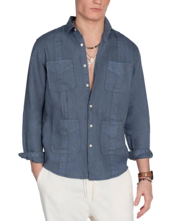 Camisa Harper & Neyer azul oscuro, de lino. Cuello italiano, cierre de botones y puños ajustables. Cuatro bolsillos en el frontal y logotipo de la marca bordado en la zona central del bajo. Canesú, costuras reforzadas y hombros caídos. Corte regular.