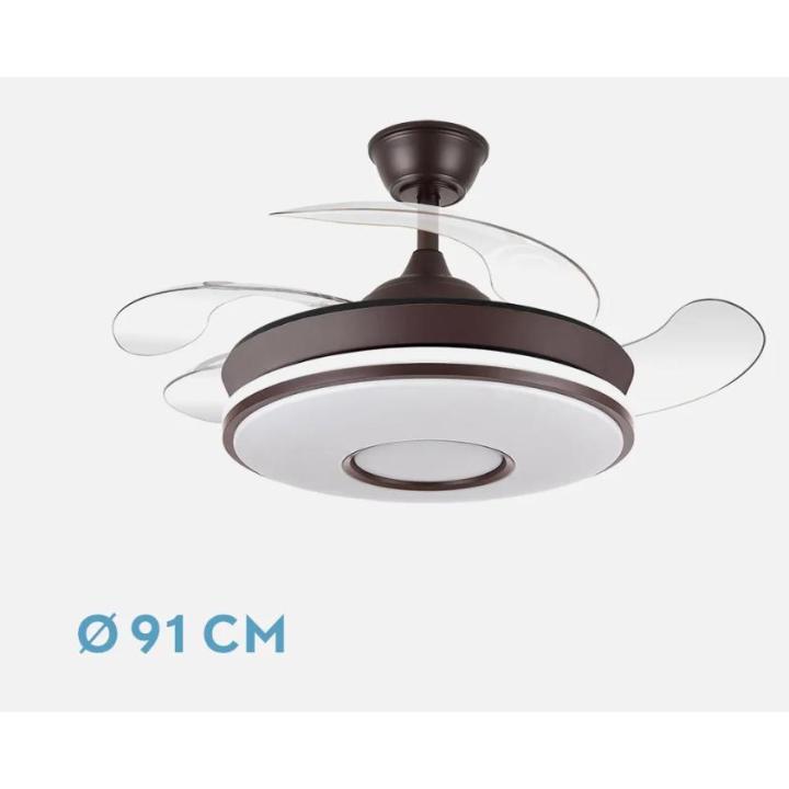 Ventilador DC serie DANI realizado en metal, policarbonato, en color MARRON-BLANCO con cuatro aspas DESPLEGABLES de ABS transparente muy resistentes. Tiene seis velocidades ajustables. Motor DC. Tecnología LED integrada con una potencia de 59W, con 3 TEMPERATURAS SELECCIONABLES DE LUZ (3000-4000-6000K) luz cálida, natural y blanco frío, y 6980 lúmenes. Control de aire verano o invierno. Su medida es de 34,5/42X50 centímetros con las aspas plegadas y de 34,5/42X107 centímetros con las aspas desplegadas. Incluye dos tijas de 12,5 y 20 centímetros, para instalar a distintas alturas. Mando a distancia INCLUIDO, REGULABLE EN INTENSIDAD, con MEMORIA DE COLOR incorporada y TEMPORIZADOR 2/4 H. Modelo disponible en color cuero, blanco, negro, marrón y níquel, además de en dos tamaños diferentes.