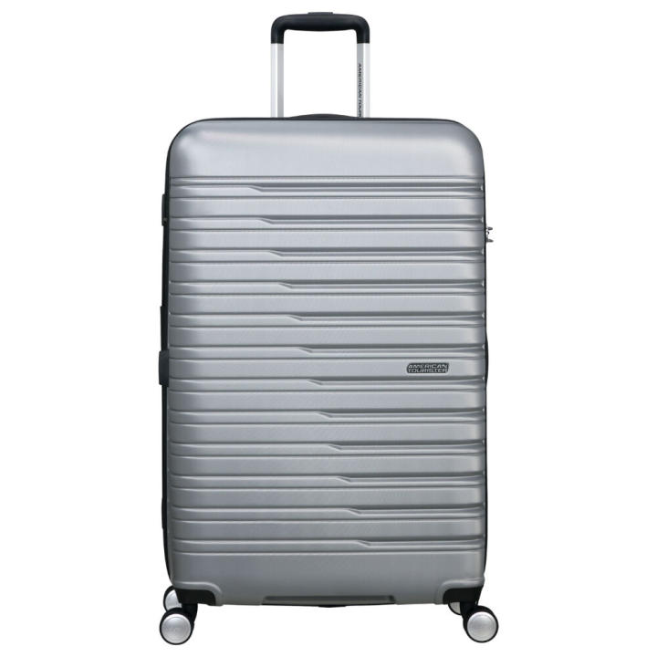 Maleta Gris American Tourister Flashline 78cm Sky Silver ResistenteEspecificaciones Modelo: Maleta Spinner (4 ruedas) Material: 100% ABS Color: Sky Silver Dimensiones: 78 x 50 x 30 cm Guía de tamaños. Dimensiones ampliadas: 78 x 50 x 33 cm Volumen: 100/109 L Peso: 4.4 kg SKU: 149769-6260Exterior Categoría: Rígido Cerradura: Candado de combinación con función TSA Cremalleras: Sí Tirador: Doble tubo Ruedas: 4 ruedas Tipo de ruedas: Multidirectional double wheels Expansible: Sí Logo: Al frenteInterior Separador interno: Sí Organización interna: Sí Material: Tejido interior fabricado con 19 botellas de PET recicladas utilizando nuestra tecnología de materiales Recyclex™ Mesh Pocket: Sí Cintas cruzadas: Sí