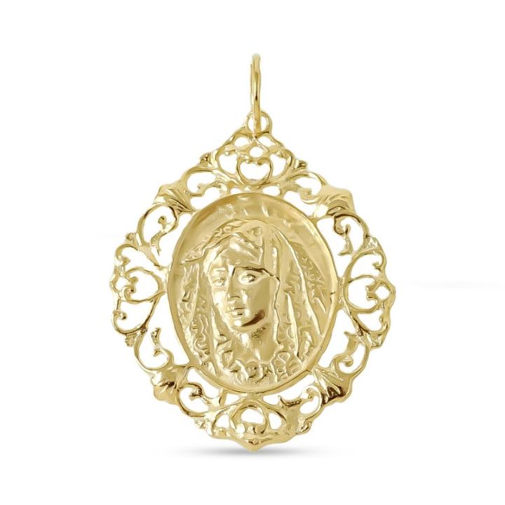 Medalla de la Esperanza Macarena de Sevilla en plata de ley 925m chapada en oro con un tamaño de 37 mm y un cerco calado que resalta su detalle y devoción. Una joya única para los fieles de la Virgen Macarena.