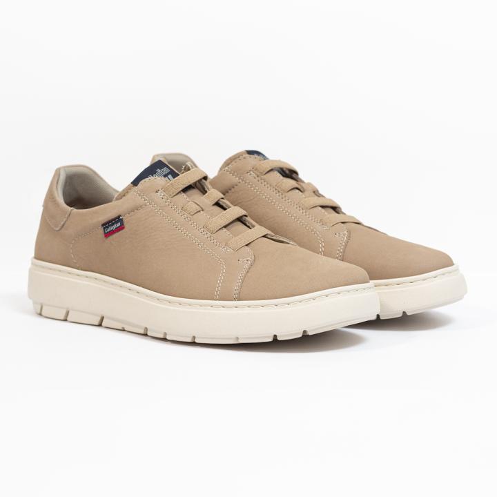 Zapato para hombre de cordones elásticos modelo Adaptable 60603 de la marca española Callaghan, fabricado en piel nobuck en color beige de aspecto aterciopelado y de gran adaptabilidad. Su forro es de tejido técnico transpirable, antibacteriano y antiolor dotado de unas microcápsulas con olor a menta. La plantilla es extraíble. Su cierre es mediante lengüeta elástica y gomas elásticas cosidas al zapato por lo que es muy fácil el calce. La altura de la suela es de 4 cm. en la parte del talón. Está fabricado con la Tecnología Adpataction, por lo que se adapta al pie y al aumento de anchura que experimenta al caminar (entre 5-8mm). Fabricado en España