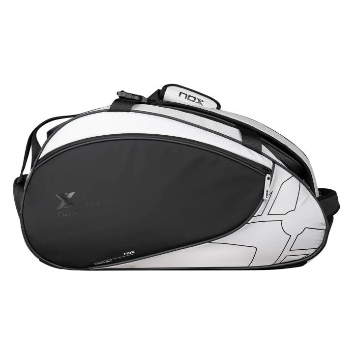Paletero Nox Luxury Master Series Blanco Negro, alta durabilidadEl Paletero Luxury Master Series de Nox en blanco y negro asegura una experiencia superior gracias a su construcción con materiales técnicos de última generación y textiles de alta calidad, lo que garantiza una notable resistencia al desgaste y un peso ligero. Es la perfecta combinación de durabilidad, elegancia y funcionalidad.Cuenta con una capacidad de 60 litros y dimensiones de 60x30x35cm, lo que facilita el transporte de todo tu equipamiento sin dejar nada atrás. Puedes usarlo como mochila o quitar las asas para mayor versatilidad y comodidad.Base sólida y asa ergonómicaEste paletero Nox se destaca por su gran capacidad de almacenamiento, con un compartimento principal de apertura lateral que puede albergar 3 palas de pádel, ropa y otros accesorios deportivos. Además, incorpora un compartimento con sistema de ventilación para zapatillas, que favorece el flujo de aire y mantiene el resto del equipo limpio y fresco.También incluye dos compartimentos laterales: uno con superficie rígida para mayor protección y otro con bolsillos distribuidos para guardar objetos personales y acceder a ellos de manera rápida y sencilla. Además, cuenta con un compartimento térmico con tecnología Nox ThermoTech donde puedes guardar hasta 2 palas de pádel y otros elementos sensibles a los cambios de temperatura.