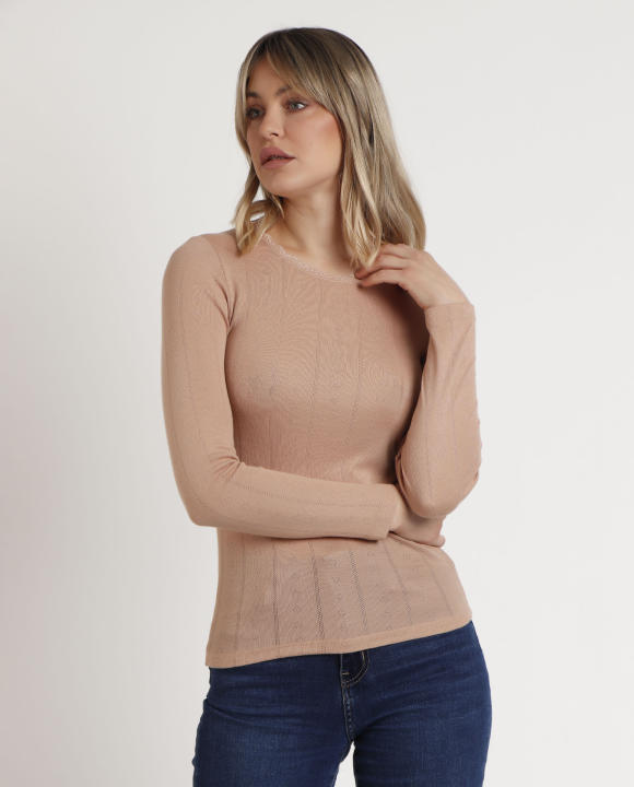 * Camiseta canalé, de punto, de manga larga y con escote redondo con detalles de puntilla lencera.