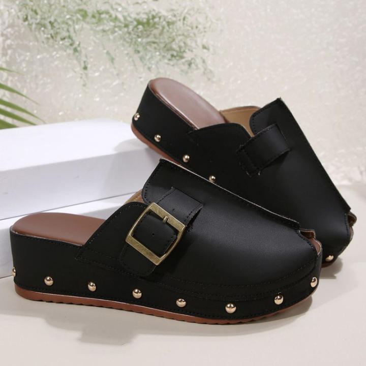 SP Zapatillas de Suela Gruesa para Mujer, novedad de Verano 2025, zapatillas de Suela Gruesa con punta Cerrada de gran tamaño y cinturón de cinturón decorativo.