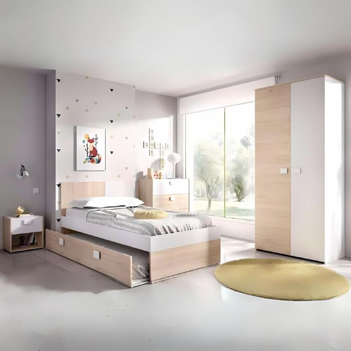 El conjunto modelo Dina Pack 6 es el conjunto perfecto para completar tu dormitorio, incluye una cama individual con un cajón inferior de arrastre, una mesita de noche con un cajón y un hueco inferior, una cómoda práctica con tres cajones y un armario de dos puertas con un interior completo. Diseñada pensando en el estilo y la funcionalidad, esta cama juvenil cuenta con un cabezal bicolor que combina natural y blanco, agregando un toque de frescura y elegancia al espacio. Además, su diseño armoniza perfectamente con el resto de los muebles de la colección Dina, permitiendo una decoración cohesiva en la habitación.