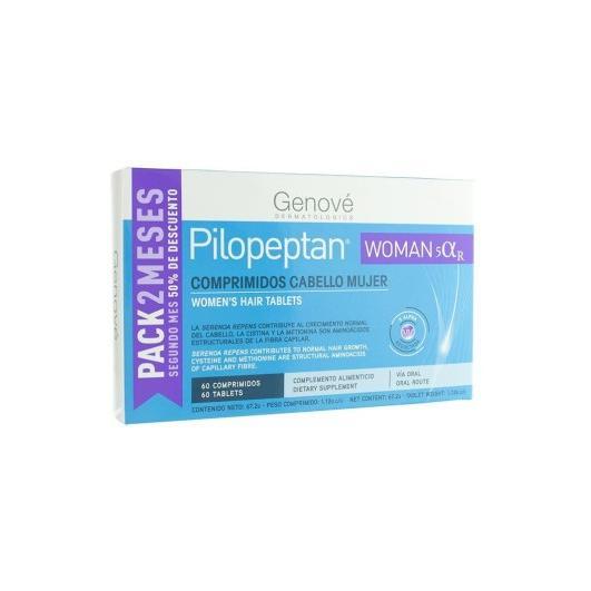 Complemento alimenticio a base de Vitamina B3, Vitamina B5, Vitamina B6, Biotina, Vitamina E,Zinc, L-Cistina, L-Metionina,Extracto Serenoa Repens, Extracto Cucurbita Pepo L, Extracto Punica Granatum L, Extracto Solidago Virgaurea L, Colágeno Hidrolizado, Ácido Hialurónico, que contribuye para el cuidado del cabello de la mujer.