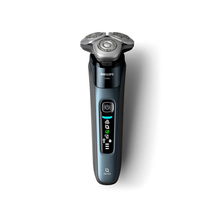 Afeitadora inalámbrica PHILIPS i9000 en color negro y azul, uso en seco y en húmedo, cabezal flexible de precisión de 360°, cuchillas SteelPrecision dobles, batería con 50 min de autonomía y carga en 1 h, incluye cortacésped desplegable y soporte de carga