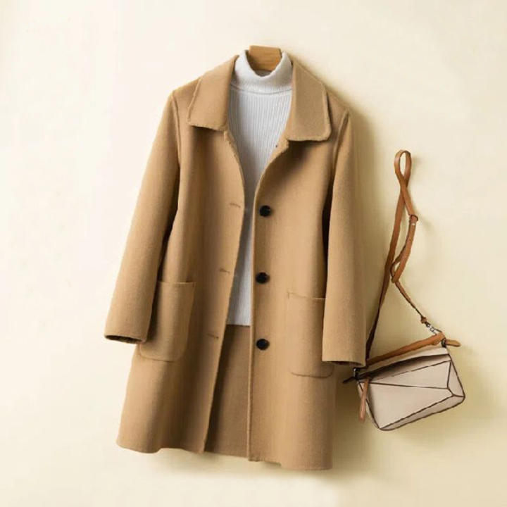Con un patrón sólido clásico y un diseño de botonadura sencilla, este abrigo irradia una elegancia de inspiración coreana.