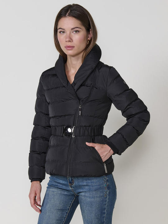 Diseñada para el invierno urbano, esta chaqueta acolchada combina funcionalidad y estilo con su distintivo doble cuello en canalé. El acolchado exterior proporciona aislamiento térmico mientras que el forro liso mantiene la comodidad. El cinturón elástico con hebilla ajustable permite personalizar el ajuste y realzar la silueta. Perfecta para transiciones entre estaciones y looks casual sofisticados.