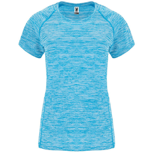 Camiseta técnica entallada de mujer en tejido poliéster de manga corta estilo ranglán. Cuello redondo. Camiseta de tejido con caída confortable y fácilmente adaptable al cuerpo.