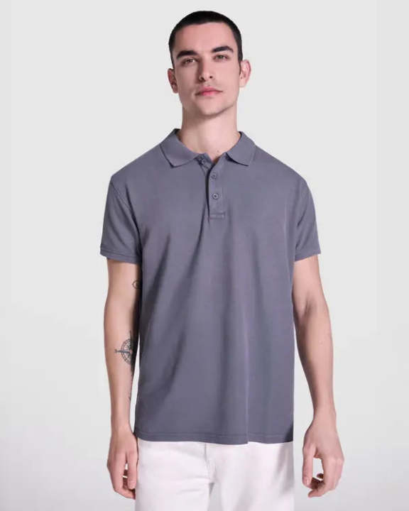 Polo de manga corta unisex, 100% algodón con acabado lavado ácido. Cuello y mangas en rib 1x1, con aperturas laterales. Cubrecosturas al tono. Tapeta con tres botones.