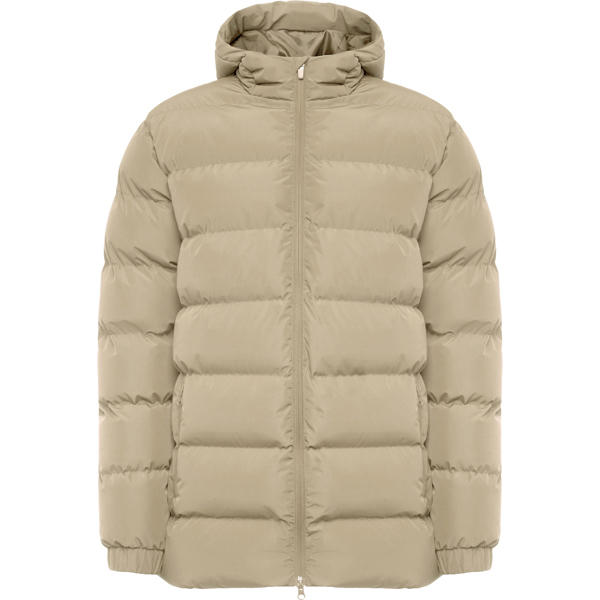 Parka acolchada. Capucha fija con visera. Cremallera frontal a tono con doble tirador y protector de barbilla. Puños elásticos. Dos bolsillos laterales con cremallera. Acceso interior para marcaje.