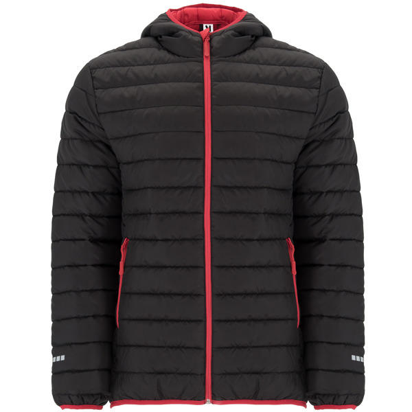 Parka deportiva acolchada con relleno tacto pluma. Cremallera frontal invertida a contraste con protector de barbilla y tirador. Capucha ajustada fija. Bolsillos laterales a contraste con cremallera invertida y tirador. Detalles reflectantes en mangas y espalda. Patronaje del bajo 4 cm más largo que el modelo NORWAY. Capucha, puños y bajos con ribete elástico a contraste.