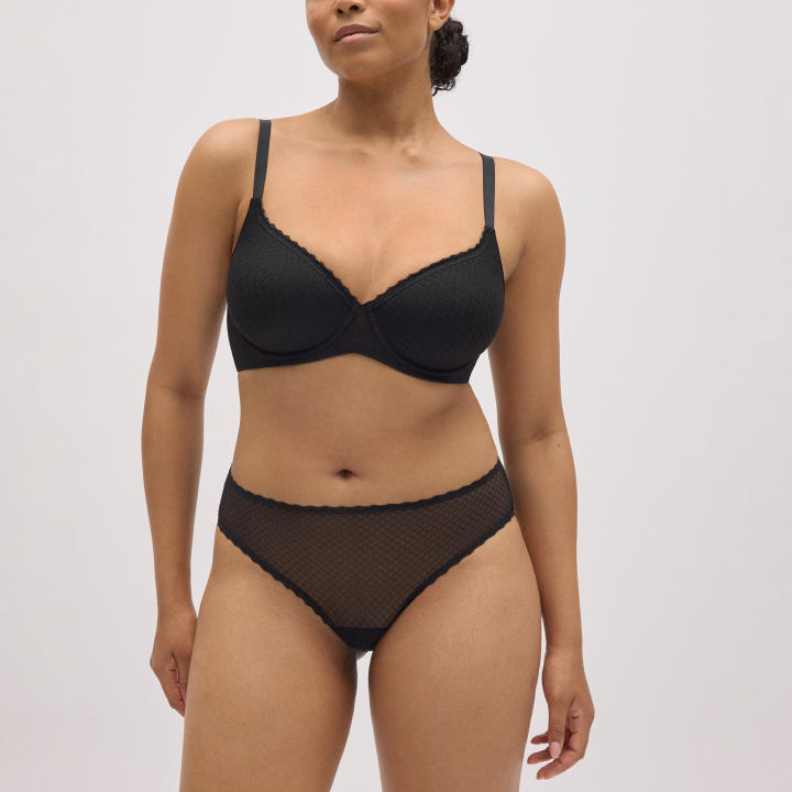 Conjunto de sujetador con aro con relleno y braga midi con transparencias. Sujetador de capacidad en Copa C. Color negro.