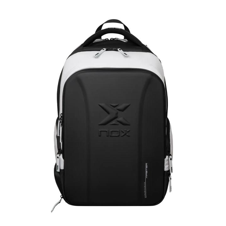Mochila Nox Luxury Master SeriesConoce la Mochila Nox Luxury Master Series, perfecta para los jugadores de pádel que desean una combinación de estilo y utilidad. Hecha con materiales técnicos de alta gama y textiles sofisticados, esta mochila garantiza durabilidad y un confort inigualable. Su diseño en elegante blanco y negro es ideal tanto para el uso diario como para tus sesiones de entrenamiento.La Mochila Nox Luxury Master Series no solo es duradera, sino también increíblemente ligera, facilitando su transporte sin sacrificar capacidad. Su compartimento principal con superficie rígida protege tu pala o portátil de manera óptima, mientras que un segundo compartimento permite guardar hasta dos palas adicionales, ropa y accesorios. Además, incluye un espacio frontal independiente para el calzado, equipado con un sistema de ventilación para mantener tus zapatos frescos.La organización es esencial y esta mochila cumple con creces: múltiples compartimentos frontales y laterales permiten llevar tus objetos personales como móvil, gafas, cartera, llaves o botella de manera ordenada. Sus correas y respaldo acolchados ofrecen un ajuste ergonómico, mejorando el agarre y la circulación del aire. Con una capacidad de 30 litros y dimensiones de 500 x 330 x 200 mm, la Mochila Nox Luxury Master Series es la compañera ideal para mejorar tu juego y estilo.