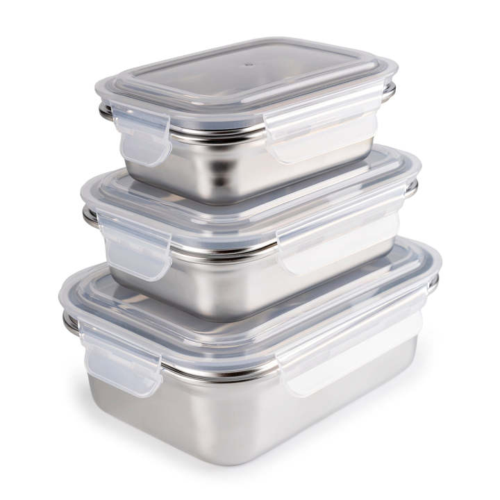 Lote de 3 Recipientes Rectangulares IBILI Keepklin fabricados en acero inoxidable 18/10 especial y con tapa de polipropileno, especialmente resistentes a la oxidación y las bacterias, aptos para microondas. Higiénicos, no transmite olores ni sabores a los alimentos. Fácilmente apilables y encajables entre sí en algunos formatos, ahorran espacio en tu cocina.