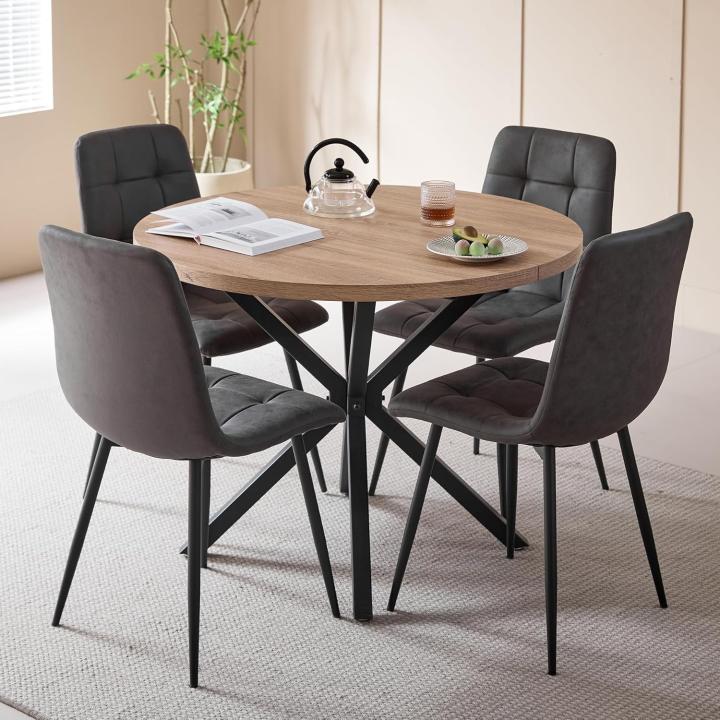 Comedor con Mesa Redonda de 100 cm y 4 Sillas Tapizadas, Conjunto de Mesa y Sillas de Comedor para Comedor, Cocina y Salón (Madera Clara+Marrón Claro (PU))