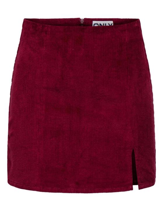 Minifalda de pana de algodón color granate, modelo corto de tiro alto con cremallera invisible detrás y pequeña abertura en un lateral del bajo. Sin forro.