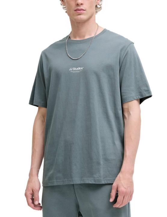 Camiseta Jack&Jones color gris azulado, modelo de cuello redondo de manga corta, corte regular con cuello redondo y pequeño logo minimalista en el pecho.