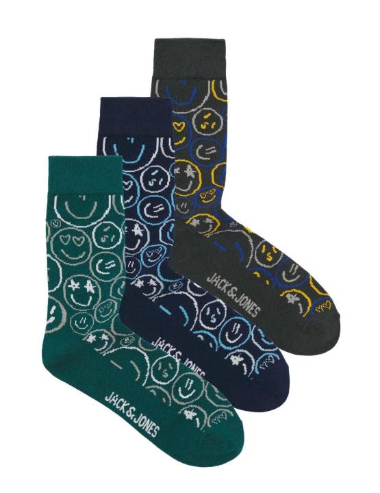 Pack de tres calcetines Jack&Jones color negro, azul y verde con estampado de caras sonrientes. De caña media, tejido acanalado y nombre de la marca en la planta.