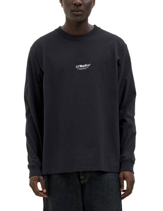 Camiseta de manga larga de Jack&Jones en color negro, cuello redondo y corte amplio. Pequeña estampación en el centro del pecho en blanco.