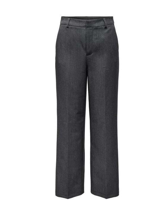 Pantalón Only de vestir de color gris oscuro, corte recto y ligeramente acampanado en el bajo, con pliegues marcados en la parte frontal. La cintura es alta, con trabillas para cinturón, cierre oculto y sin bolsillos visibles en la parte delantera.