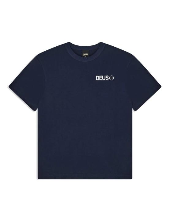 Camiseta Deus ex Machina modelo Beams, diseñada en color azul marino. Cuello redondo y manga corta. Logo en el pecho y letras blancas en la espalda.