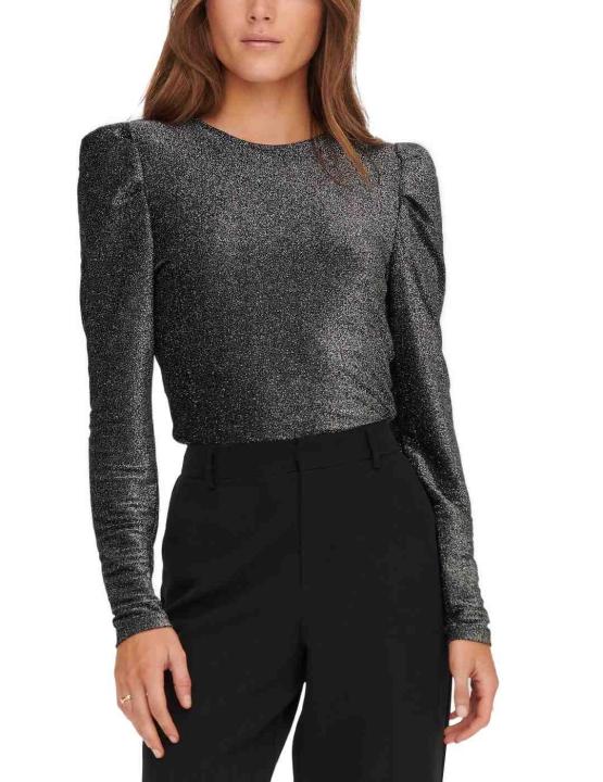 Camiseta color gris en tejido de punto metalizado, modelo de cuello redondo, manga larga y detalle de hombros abullonados. Corte slim fit.