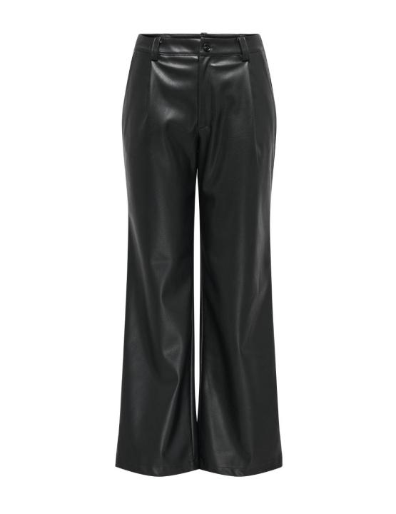 Pantalón Only color negro, de polipiel. Tiro alto, cierre de botón y cremallera, dos bolsillos y trabillas para el cinturón. Dos pinzas delanteras y otras dos traseras. Corte de la pernera ancho, wide leg.