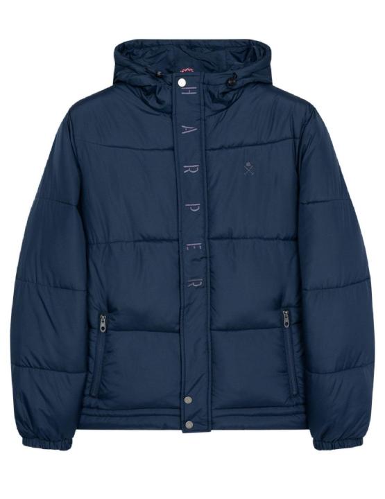 Plumas Harper & Neyer azul, guateado. Capucha con gomas de ajuste, cuello ligeramente subido y cierre combinado de cremallera, solapa y botón. Puños elásticos, dos bolsillos de mano más uno interior y logotipo de la marca bordado en zona izquierda del pecho. Bajo ajustable con tiradores y hombros ligeramente caídos y corte regular.