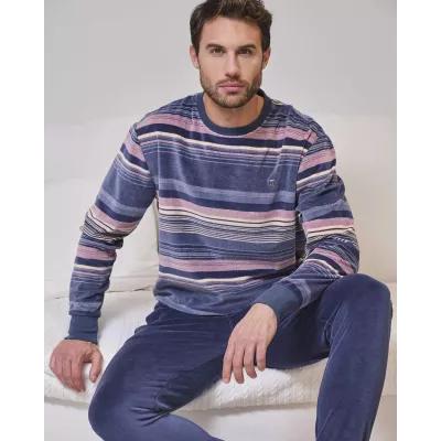 El pijama de hombre Massana modelo P751323 es perfecto para quienes buscan estilo, suavidad y abrigo durante el invierno. Este conjunto está compuesto por una camiseta de manga larga en tonos marino con rayas horizontales multicolor, que aporta un aire moderno y dinámico, combinada con un pantalón largo liso en azul marino con cinturilla elástica y puños, diseñado para brindar comodidad y un ajuste seguro. Su confección en 80% algodón y 20% poliéster ofrece una textura suave, transpirable y resistente, ideal para el descanso diario.