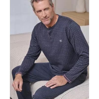 El pijama de hombre Massana modelo P751336 es una elección perfecta para quienes buscan un estilo elegante y cómodo durante el invierno. Este conjunto incluye una camiseta de manga larga en gris oscuro con un discreto estampado de pequeños puntos en rojo y azul, además de cuello redondo tipo henley con botones, que añade un toque clásico y masculino. Se completa con un pantalón largo liso en gris con cinturilla elástica, diseñado para ofrecer confort y libertad de movimiento. Su confección en 50% algodón y 50% poliéster asegura suavidad, transpirabilidad y resistencia para un uso diario.