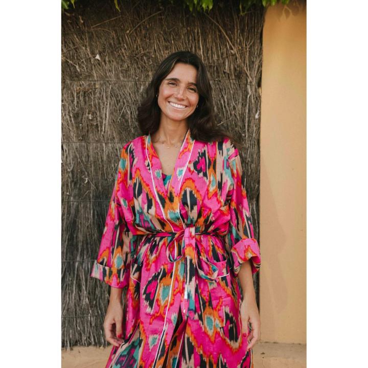 Kimono – bata estampada de algodón 100%. Cinturón y dos bolsillos. Destaca por ser 100% algodón, los distintos estampados los creamos con la técnica blockprint, la cual se realiza con sellos de madera tallados y tintes naturales, es una de las técnicas más tradicionales procedentes de la India. Al ser la tela hecha a mano con tintes naturales, puede presentar alguna mancha de pintura que no es considerado defecto. Creamos piezas únicas y artesanales. Talla Única. La modelo mide 1,60 m.