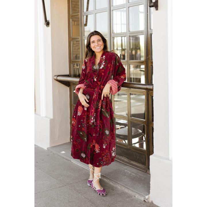 Kimono – bata estampada de terciopelo. Cinturón y dos bolsillos. Al ser el tejido estampado a mano con tintes naturales, puede presentar alguna mancha de pintura que no es considerado defecto. Creamos piezas únicas y artesanales. Talla Única. El forro interior puede variar.