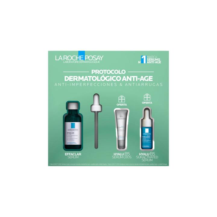 El Anti-Imperfecciones & Antiarrugas es un pack completo antiedad que combina el Sérum Effaclar 30 ml con dos productos de regalo: un Sérum de Ojos Hyalu B5 5ml y un Sérum Hyalu B5 10ml. Esta rutina ayuda a reducir las imperfecciones gracias a una alta concentración en complejo triácido. Una fórmula que purifica la piel, alisa la textura y reduce finas líneas, con una exfoliación diaria para afinar la textura de la piel a partir del 1er día.