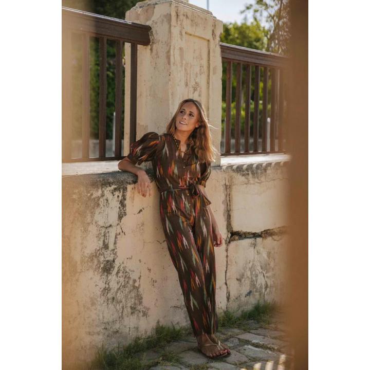 Mono largo estampado de corte recto con cuello mao. Manga corta con puño y cinturón en el mismo tejido para ajustar. Cierre frontal con botones.