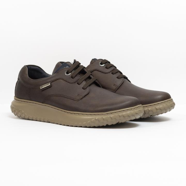 Zapato para hombre modelo Terrain Water 60900 en color marrón chocolate, de la marca española Callaghan, fabricado en piel natural curtida de forma artesanal. Es perfecto para climas húmedos y para la lluvia, ya que ofrece una resistencia óptima al agua gracias a que tiene incorpora la tecnología WaterAdapt. Es además Extralight, fabricada con un material de gran ligereza y flexibilidad que favorece la amortiguación. Incorpora además la tecnología Adaptaction, por lo que se adapta al pie y al aumento de anchura que experimenta al caminar (entre 5-8mm). La plantilla es extraíble. Fabricado en España
