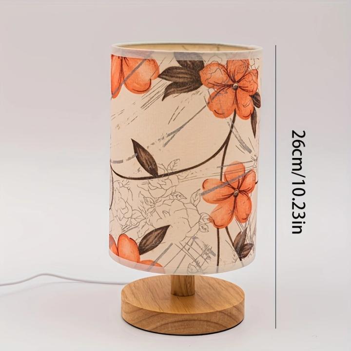 Fabricada con una pantalla de tela estampada con motivos florales y una base de madera, esta lámpara combina estilo y sostenibilidad.