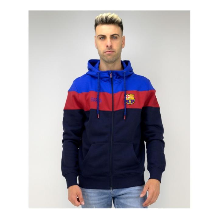 Sudadera del FC Barcelona tricolor: azul claro, rojo y azul marino. Escudo del club en el pecho. Puños y cintura elásticos, cuello alto y cierre con cremallera frontal completa. Con capucha y dos bolsillos laterales.