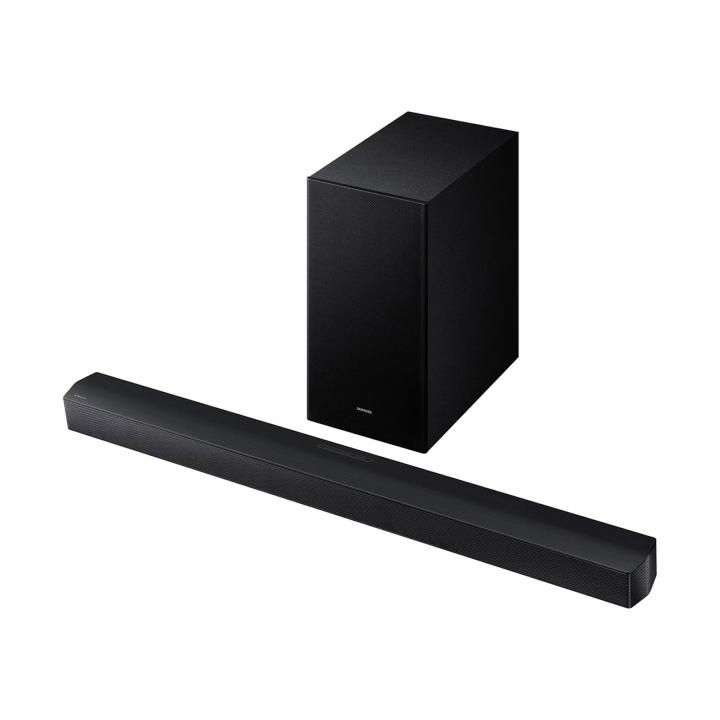 Barra de sonido con subwoofer integrado Samsung HW-B650F en color negro con 3.1 canales, 4 altavoces, modo de mejora de voz, conectividad Bluetooth 4.2, compatible con sonido envolvente inalámbrico, HDMI ARC y óptico.Incluye control remoto.