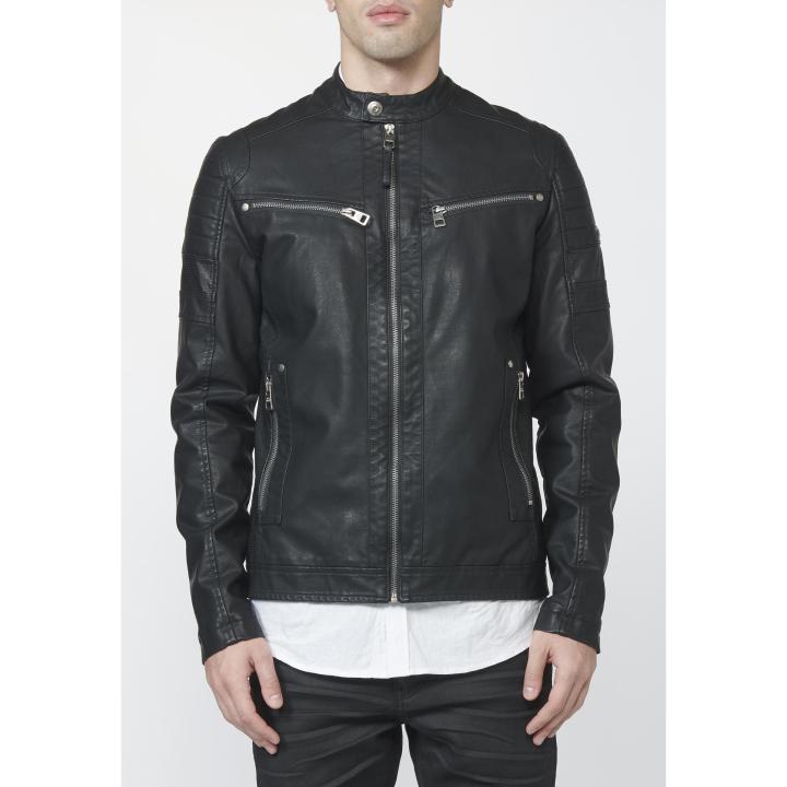 Cazadora efecto piel. slim fit. cuello tira. manga larga, puños con cremallera. bolsillos exteriores e interior con cierre de cremallera. cierre frontal con cremallera. composición: 55% pu 45% algodón forro acolchado ligero: 100% poliéster. el modelo usa la talla m.
