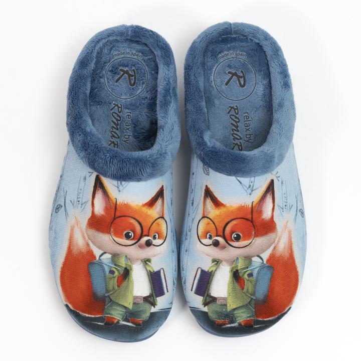 Zapatilla de casa para señora modelo 2100 fabricadas en suapel en color azul con un vistoso zorro en el empeine. Su diseño destalonado permite un calce rápido. La suela es vulcanizada de goma antideslizante. La plantilla es extraíble, de espuma viscoelástica (memory foam) se adapta a la forma del pie, ofreciendo una pisada suave, ergonómica y con gran amortiguación. Fabricado en España