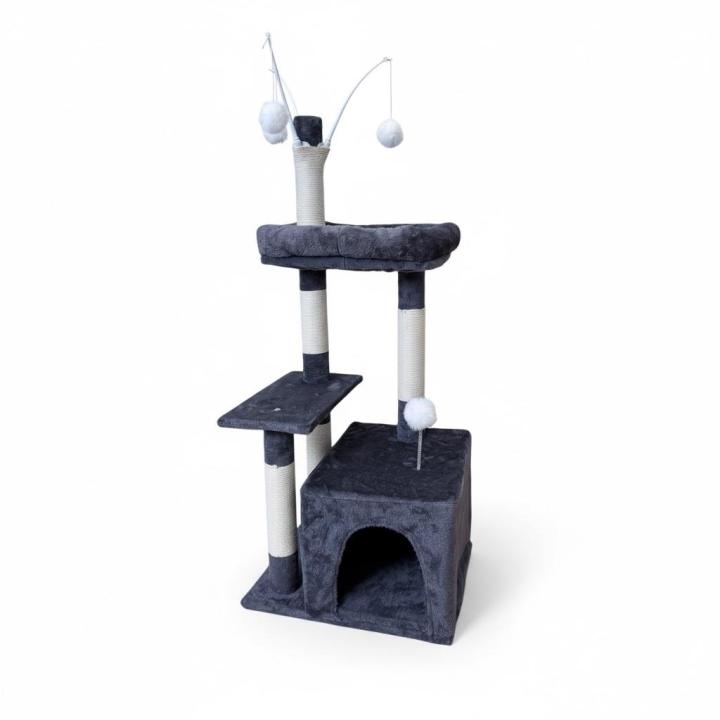 Este rascador multifuncional en color gris es perfecto para ofrecer a tu gato un espacio completo de descanso y entretenimiento en casa. Su diseño compacto aprovecha la altura (125 cm) para que tu mascota pueda trepar, jugar y relajarse cómodamente.