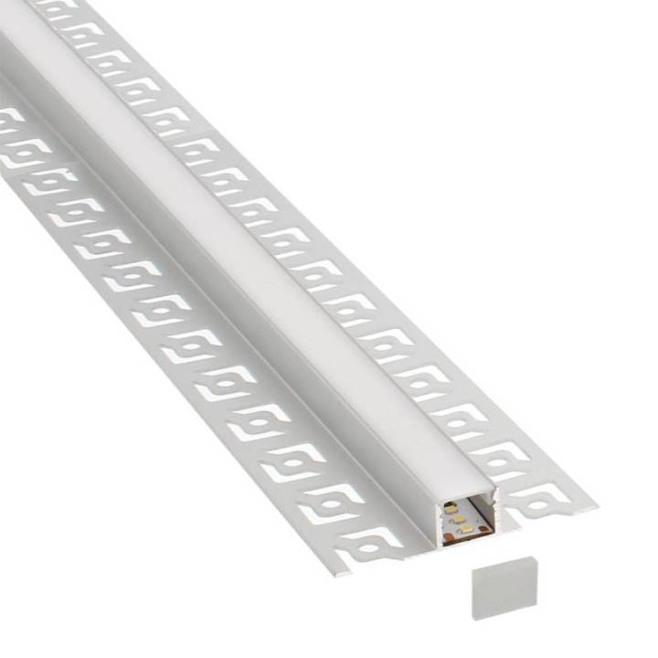 Perfil fabricado en aluminio de alta calidad ideal para iluminación de cualquier ambiente (baños, cocinas, pasillos, salones, etc) Se instala en obra entre el pladur, yeso, azulejos, etc. Dispone de aletas troqueladas que facilita la inserción del cemento u otro material para asegurar así un agarre perfecto a la pared.