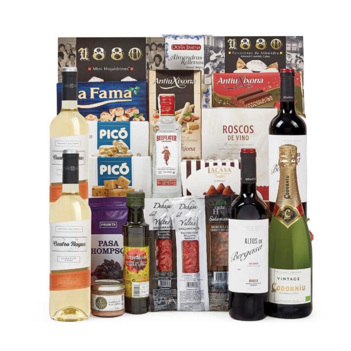 ¡El lote que lo tiene absolutamente TODO a precio imbatible! Ibéricos de bellota, 5 botellas de lujo (2 Rioja Crianza + 2 Rueda Vendimia Nocturna + Cava Codorníu + Ginebra Beefeater), la selección más bestia de dulces navideños y caprichos gourmet. Ideal empresas, clientes, empleados o familia numerosa. Llega en caja grande preciosa lista para impresionar.