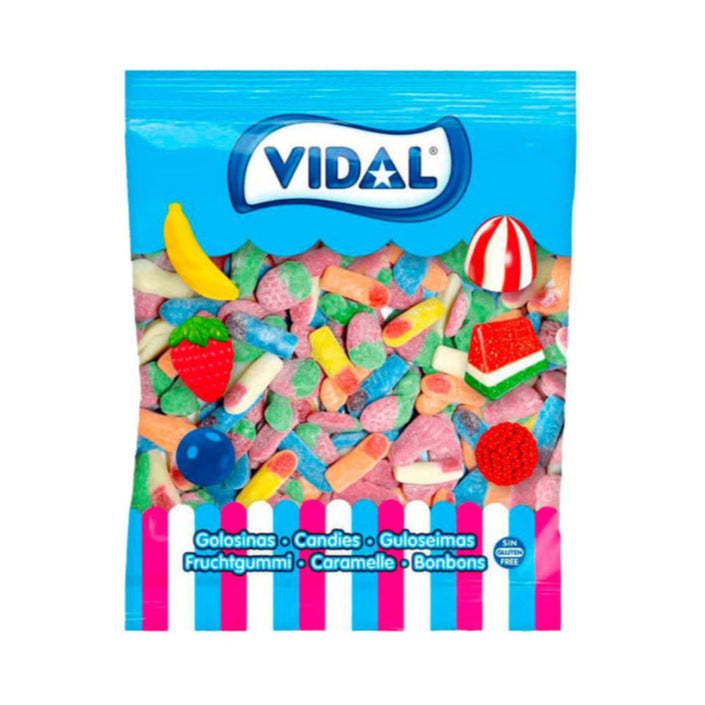 El Megasurtido Ácido Vidal es un surtido de golosinas clásicas con azúcar pica, en el que aparecen los clásicos pies, fresas y dedos pica de la marca Vidal. Seguro que ya has comprado alguna vez este producto en tu establecimiento habitual.