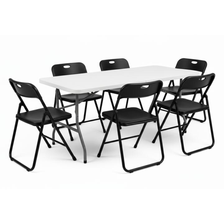 ¡Eleve la imagen de su espacio al instante! Este Pack Ahorro combina estratégicamente nuestra Mesa Plegable de 180 cm en blanco puro con 6 Sillas Plegables en color negro.