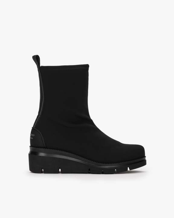 Botines de tejido elástico de color negro. Su tejido y silueta permite calzarlos cómodamente, además de ofrecer un ajuste óptimo. Los botines con plataforma de ante elástico combinan elegancia y comodidad. Una opción moderna y chic para aportar un toque casual a tus outfits.