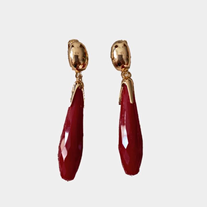 Pendientes colgantes largos para mujer en color granate y dorado.