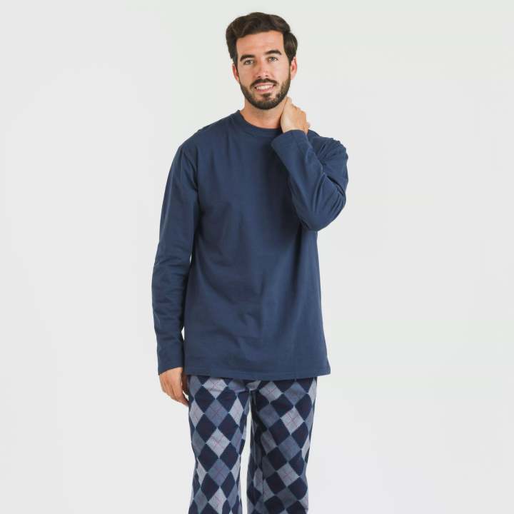 Pijama de hombre compuesto por camiseta de manga larga y pantalón largo de franela. Camiseta lisa de color azul y pantalón de rombos en diferentes tonos azules. El pantalón del pijama tiene la cintura elástica recubierta con una cinta para ajustar. Descubre nuestra gama de pijamas de hombre cómodos, confortables y con estilo y disfruta de tus descanso con tejidos de calidad. Su composición de 100% algodón ayuda a que el cuerpo transpire a la vez que conserva su calor en invierno, ofreciendo por ello una sensación térmica ideal para climas donde los inviernos son suaves. Composición: Camiseta: 100% algodón Pantalón de franela: 100% algodón El modelo mide 1.82 cm y lleva la talla M.